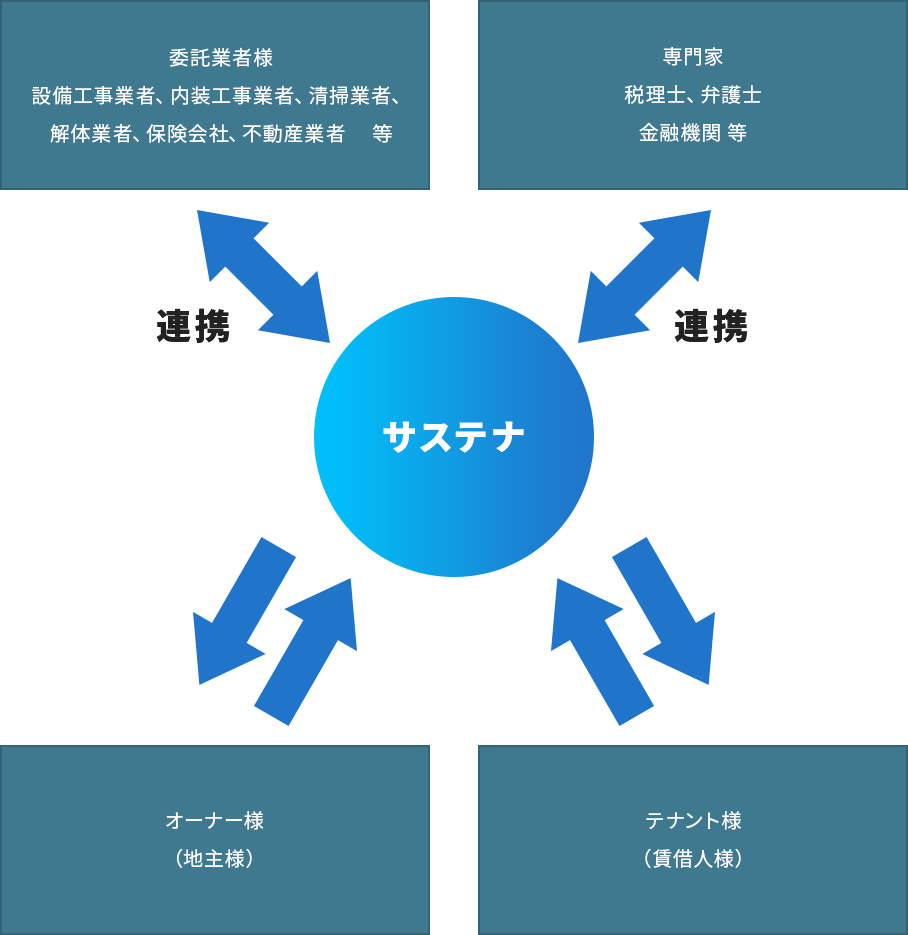 物件の品質と機能を健全に維持していくためは、当社のみならず外部委託業者様や専門家のご支援・ご協力が不可欠です。また、当社単独では、時に偏った対応を取ってしまう可能性もあります。そこで、外部の専門的な技術や知見を積極的に活用し、オーナー様、テナント様の双方にとって最善な対応を取ることを心がけています。